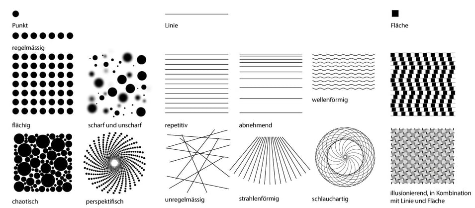 Wenn eine Oberfläche ein Muster aufweist, dann sehen wir darin eine Struktur. Muster sind repetitive Formen, die gemeinsame visuelle Merkmale aufweisen. Bei den Regentropfen ist es die Plastizität und die glänzende Oberfläche, bei den Sommersprossen die dunkle Pigmentierung. Die meisten Muster der Natur sind wohl unregelmässig: Sanddünen, Schneeverwehungen, Wellenbewegungen, Schäfchenwolken, Tannenwald. Muster sind besonders auffällig, wenn sie regelmässig wirken oder in einer Kombination von regelmässig/unregelmässig vorkommen. Grafisch betrachtet unterscheiden wir drei geometrische Elemente, die als Muster vorkommen können: Punkt, Linie und Fläche. Diese Elemente können regelmässig aneinandergereiht werden, aber auch in anderen Variationen vorkommen.