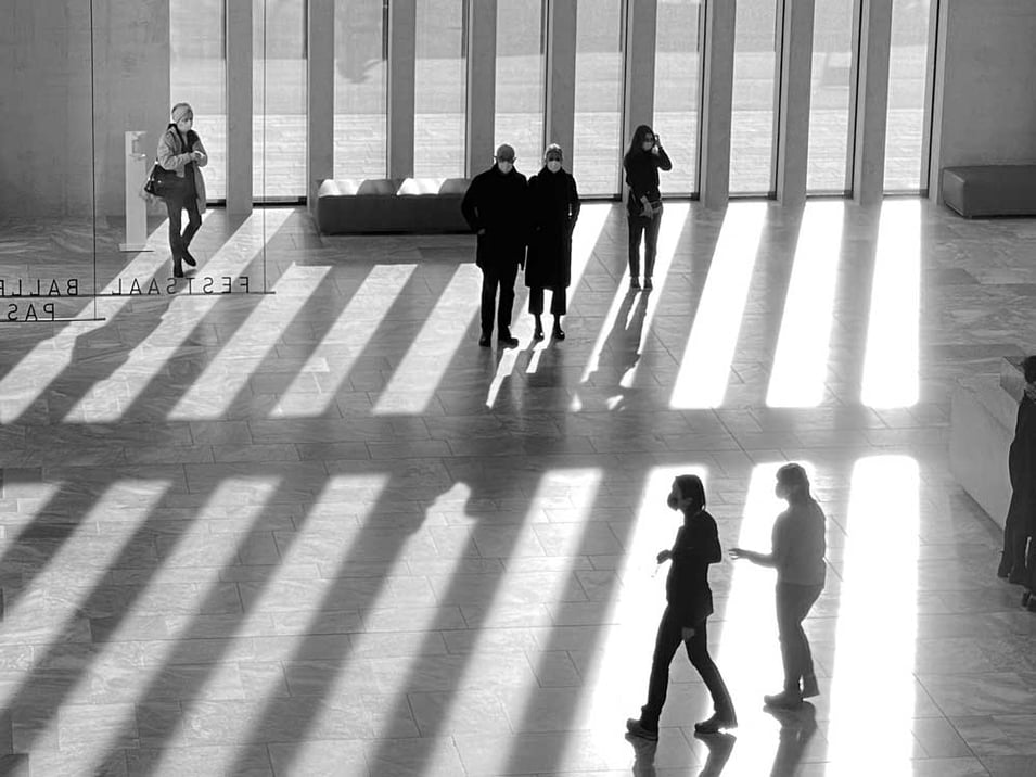 Kunsthaus Zürich. Durch die senkrechten Betonlamellen fliesst das Licht des Nachmittags in die Eingangshalle – es strukturiert auf natürliche Weise die Fliesen.