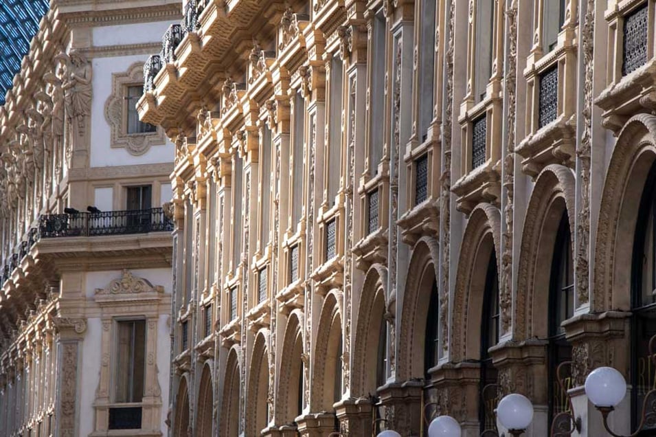 Galleria Vittorio Emanuele II in Mailand. Hier begegnen sich senkrecht, waagrecht und rund.