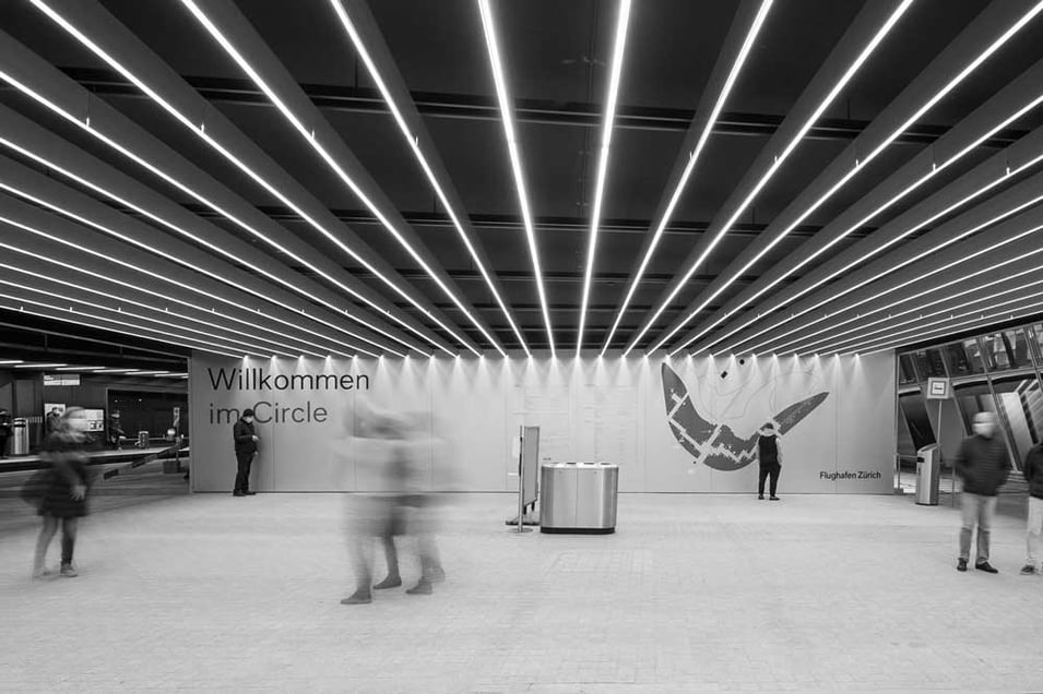 The Circle, Zürich-Flughafen. Neonlichter bilden eine perspektivische Wirkung.