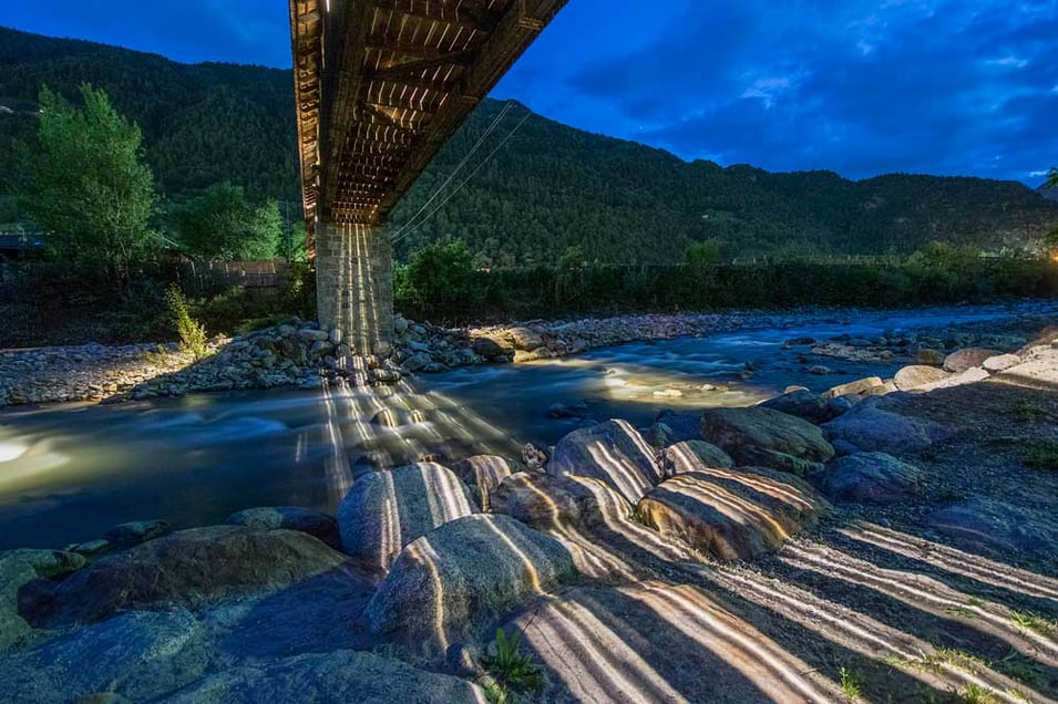Ein hölzerner Fussgängersteg führt bei Algund im Südtirol über die Etsch. Sie wird nachts von Laternen erhellt, die Lichtstrahlen dringen durch die Bohlen auf den Grund und bilden ein Linienmuster auf den Felsblöcken ab.