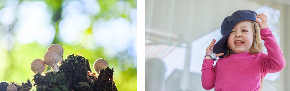 Der Bildausschnitt hängt mit der Blick- oder Bewegungsrichtung des Motivs zusammen. Wenn das Kind nach oben schaut, ist mehr Raum oben angesagt. Ein höherer Kamerastandpunkt (von oben nach unten fotografieren) betont den Blick nach oben. Das Kind links steht in einer Extremposition am unteren Bildrand, während es im rechten Bild normal eingemittet ist.