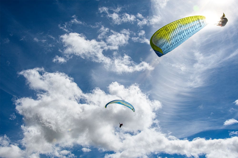 Vom Stanserhorn Richtung Pilatus fotografiert. Zwei Gleitschirme zeichnen ihre Linien in den Himmel. Ein wenig aussagekräftiges Bild – zu weit weg.